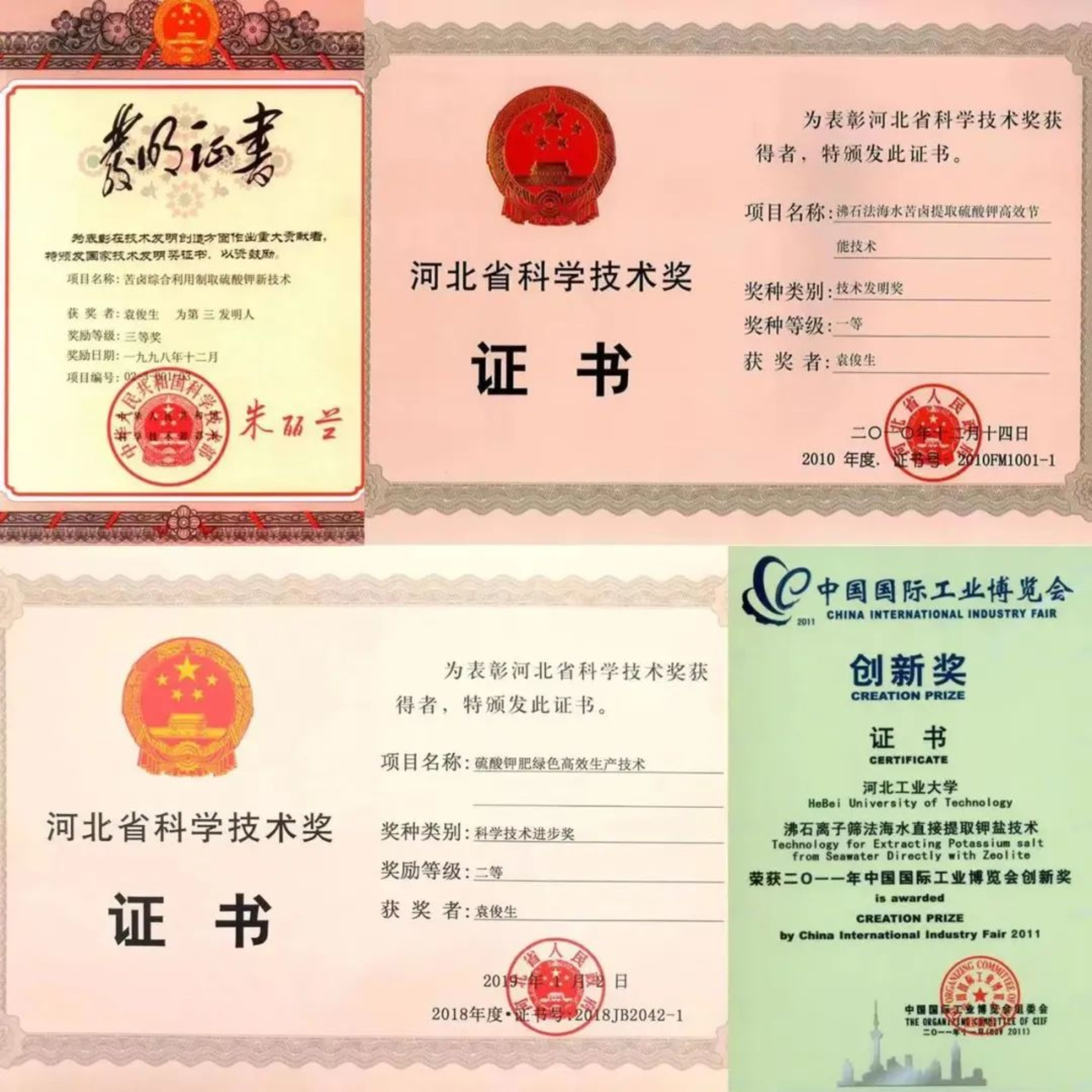 沸石法海水提钾技术成果共授权专利28项,“苦卤综合利用制取硫酸钾新技术”获得国家技术发明三等奖,“沸石法海水苦卤提取取硫酸钾高效节能技术”获得河北省技术发明一等奖,“硫酸钾肥绿色高效生产技术”获得河北省科技进步二等奖,“沸石离子筛法海水提钾工程设计规范”(HY/T0302-2021)行业标准于2021年获得实施。